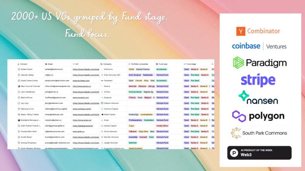 Introducing the ultimate resource for entrepreneurs and startups seeking investment opportunities—the 2000+ US VCs database. This comprehensive product provides an extensive collection of venture capital firms in the United States, organized by fund stage, fund focus, and location.